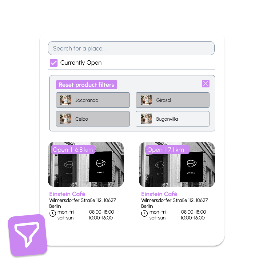 Easily filter stores by product category and view results directly on the map or in the store list.